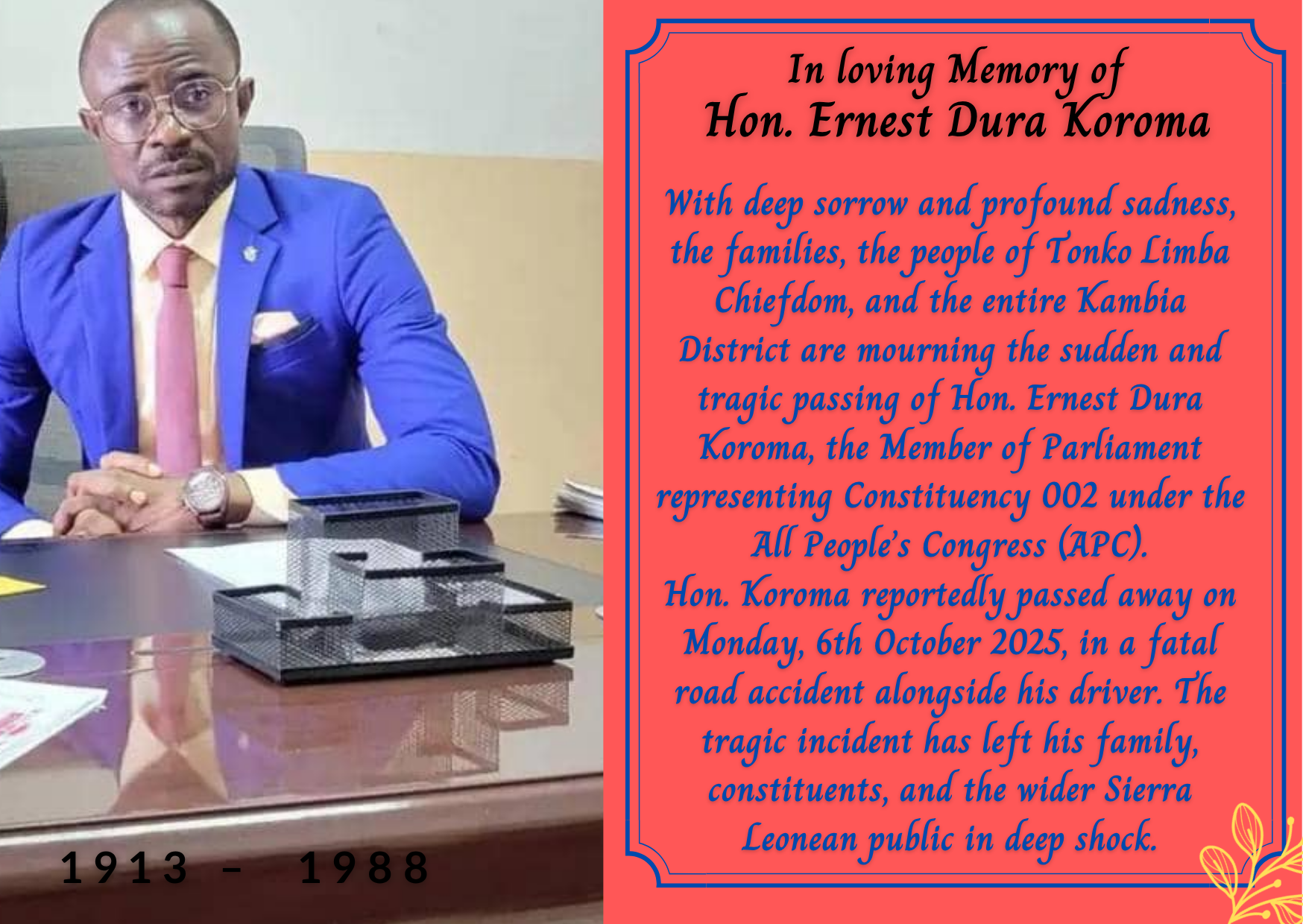 Hon. Koroma reportedly passed away on Monday, 6th October 2025, in a fatal road accident alongside his driver. The tragic incident has left his family, constituents, and the wider Sierra Leonean public in deep shock.