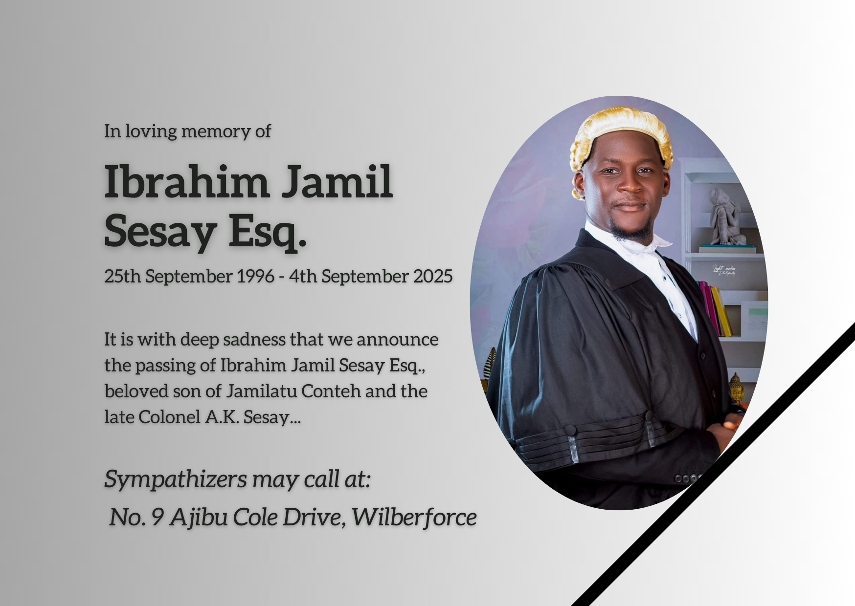 It is with profound sorrow that we announce the passing of Ibrahim Jamil Sesay Esq., beloved son of Jamilatu Conteh and the late Colonel A.K. Sesay.