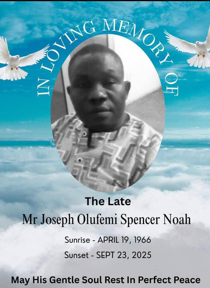 It is with heavy hearts that we announce the passing of our dearly beloved Father, Husband, Uncle, Brother, Nephew, and Friend – Mr. Joseph Olufemi Spencer Noah, who peacefully departed this life at his residence on Tuesday, 23rd September 2025. 🕊