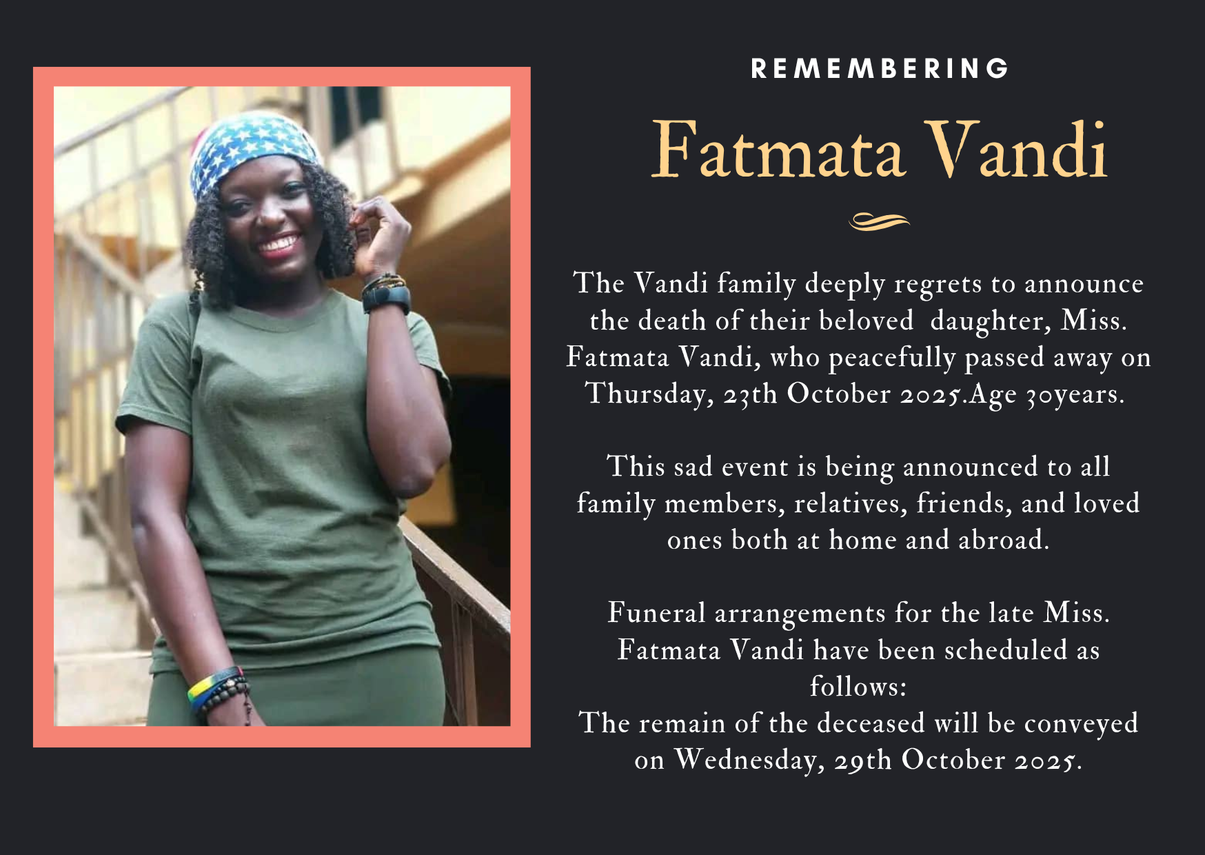 The Vandi Family deeply regrets to announce the passing of their beloved daughter, Miss Fatmata Vandi, who peacefully departed this life on Thursday, 23rd October 2025, at the age of 30 years.