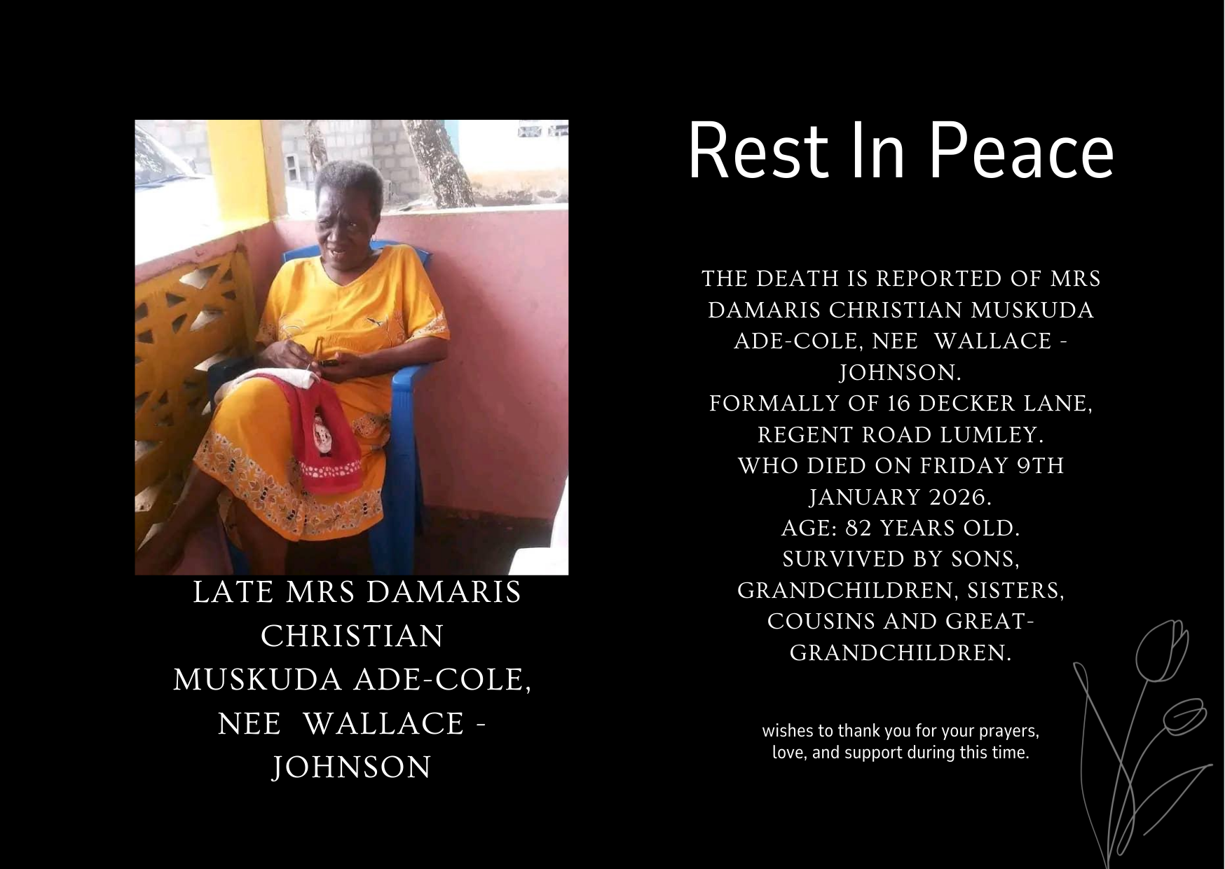 The death is reported of Mrs Damaris Christian Muskuda Ade-Cole, Nee Wallace -Johnson.