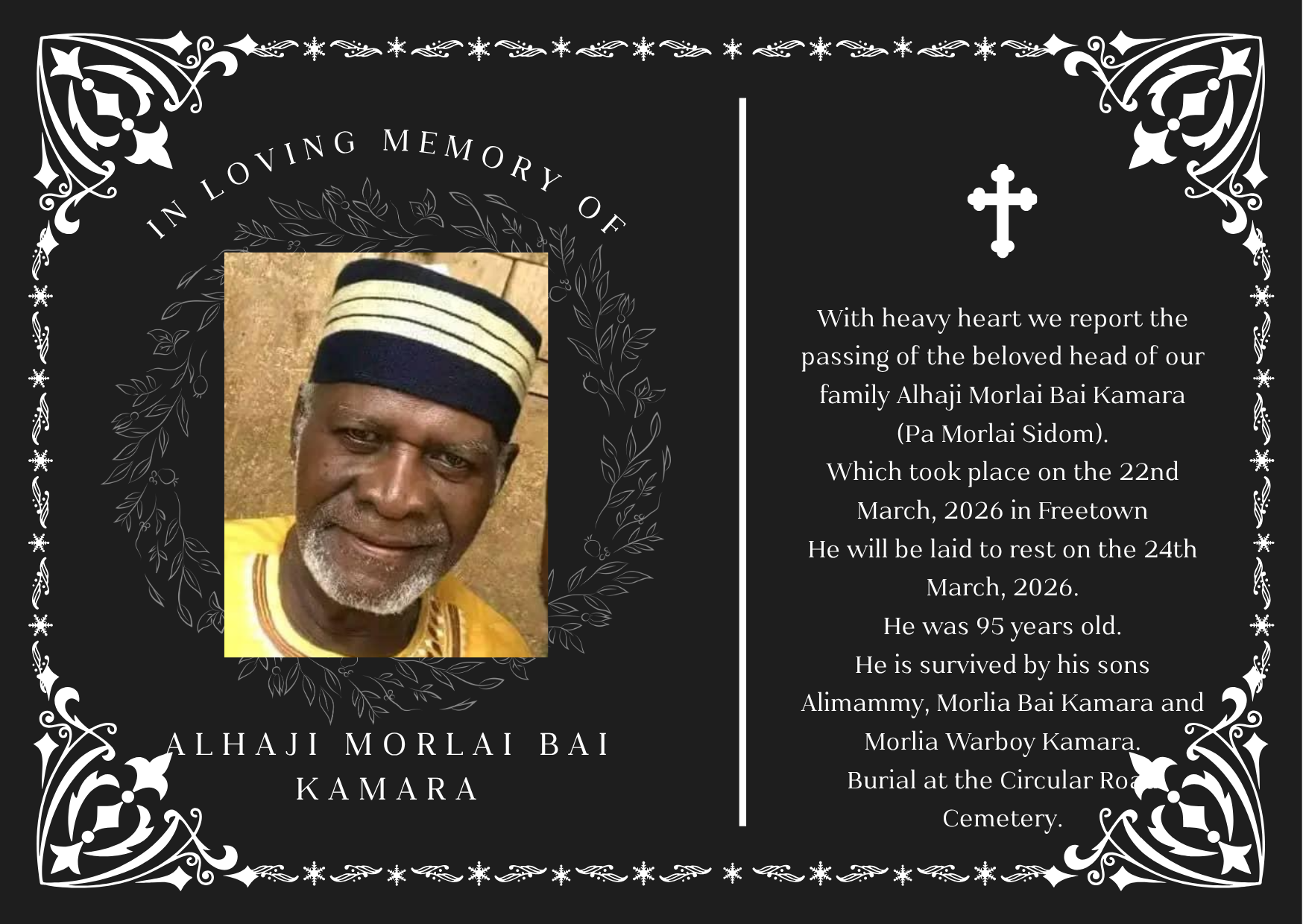 He is survived by his sons Alimammy, Morlia Bai Kamara and Morlia Warboy Kamara.