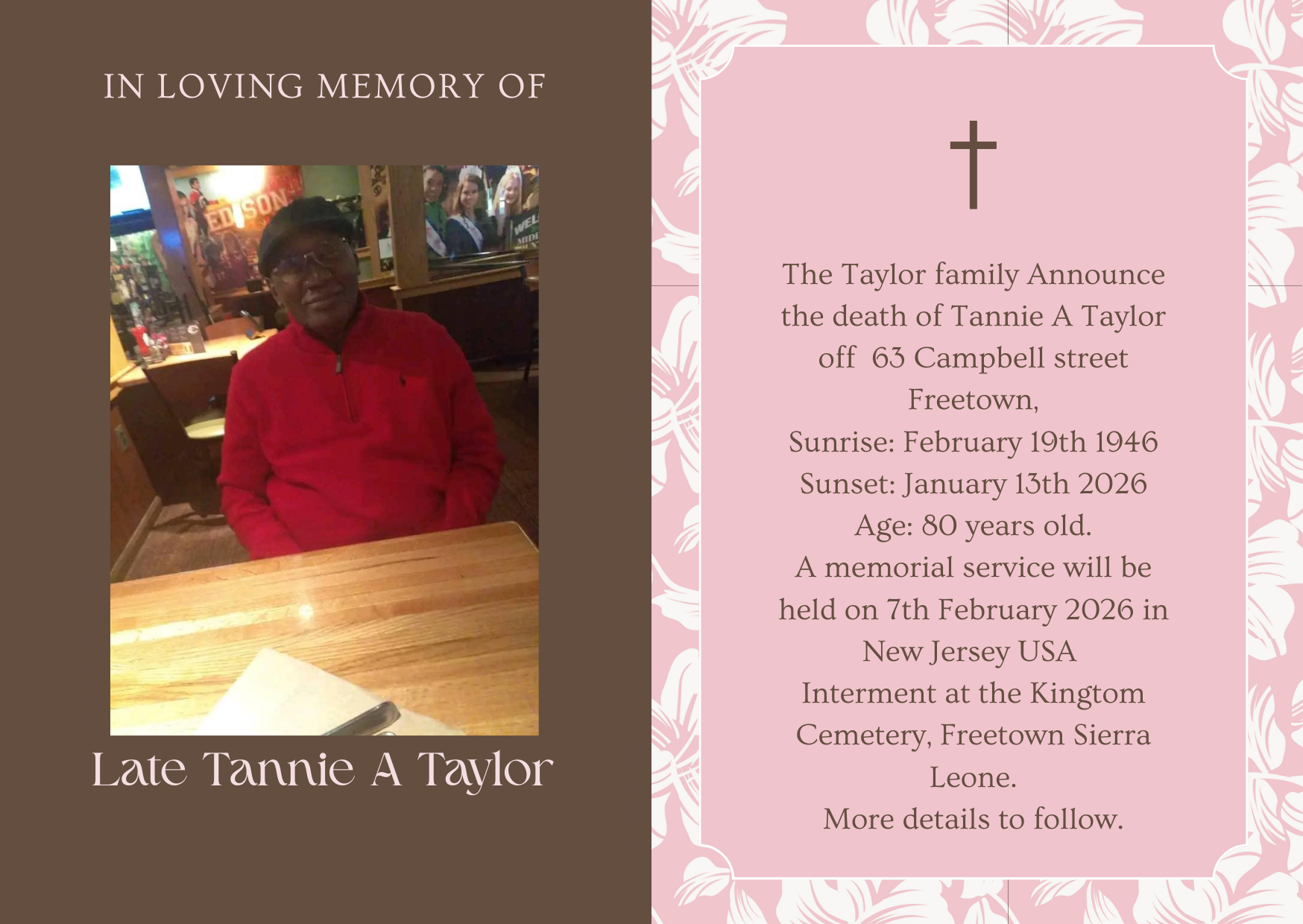 The Taylor family Announce the death of Tannie A Taylor off 63 Campbell street Freetown,