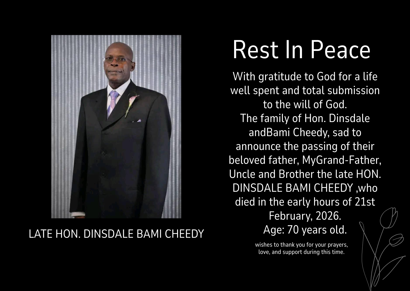With gratitude to God for a life well spent and total submission to the will of God.The family of Hon. Dinsdale andBami Cheedy, sad to announce the passing of their beloved father, MyGrand-Father, Uncle and Brother the late HON. DINSDALE BAMI CHEEDY ,who died in the early hours of 21st February, 2026.Age: 70 years old.
