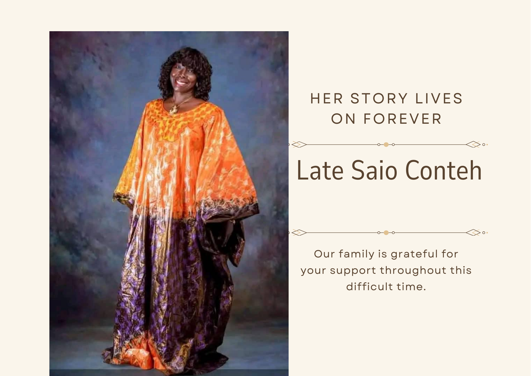 With deep sorrow, we announce the passing of our beloved mother, Saio Conteh, at the age of 63. She departed this life on 27th January, 2026 after a period of illness, leaving behind cherished memories that will forever remain in our hearts.