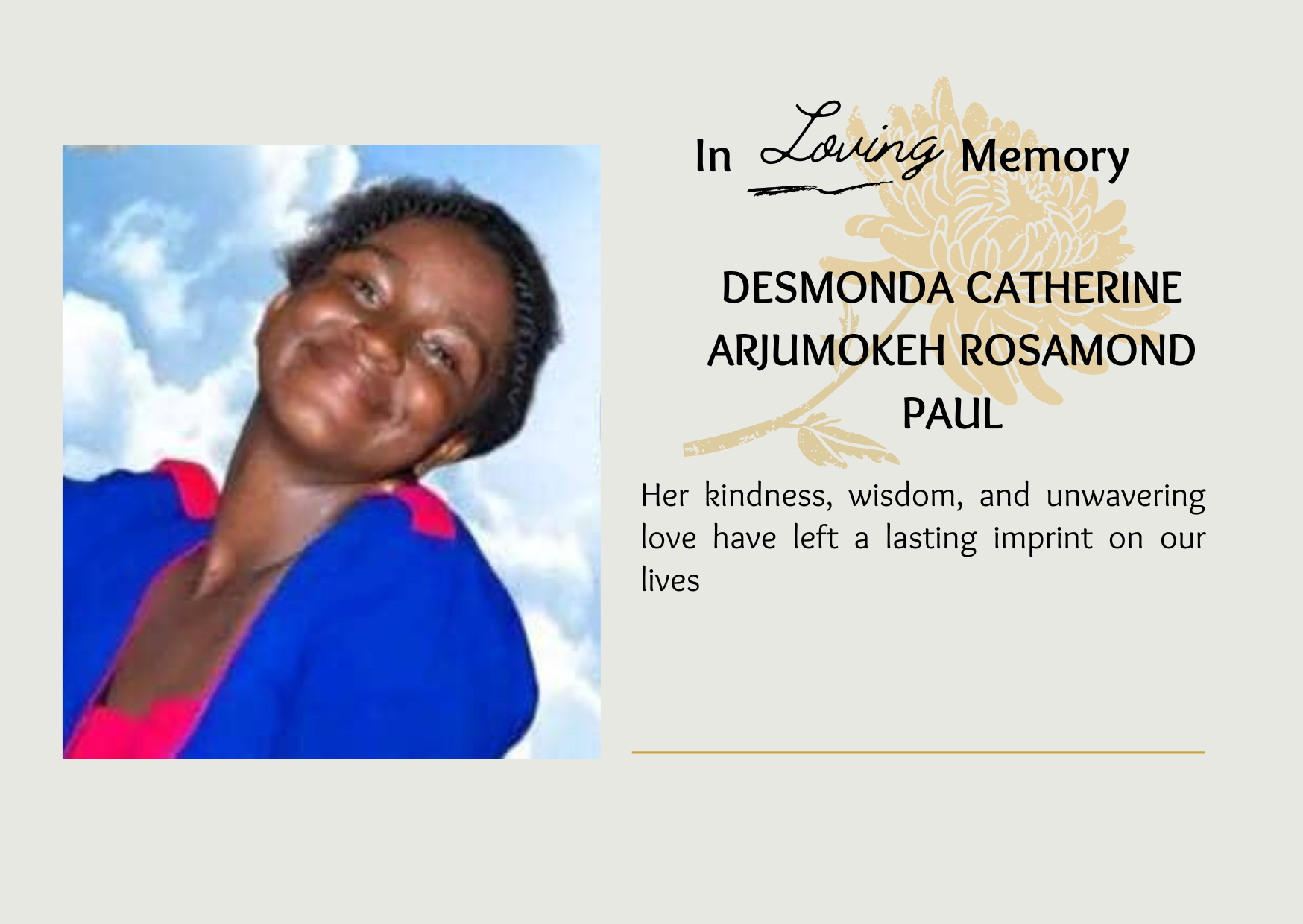 The death is reported of Ms. DESMONDA CATHERINE ARJUMOKEH ROSAMOND PAUL, who died on 25th March, 2026.