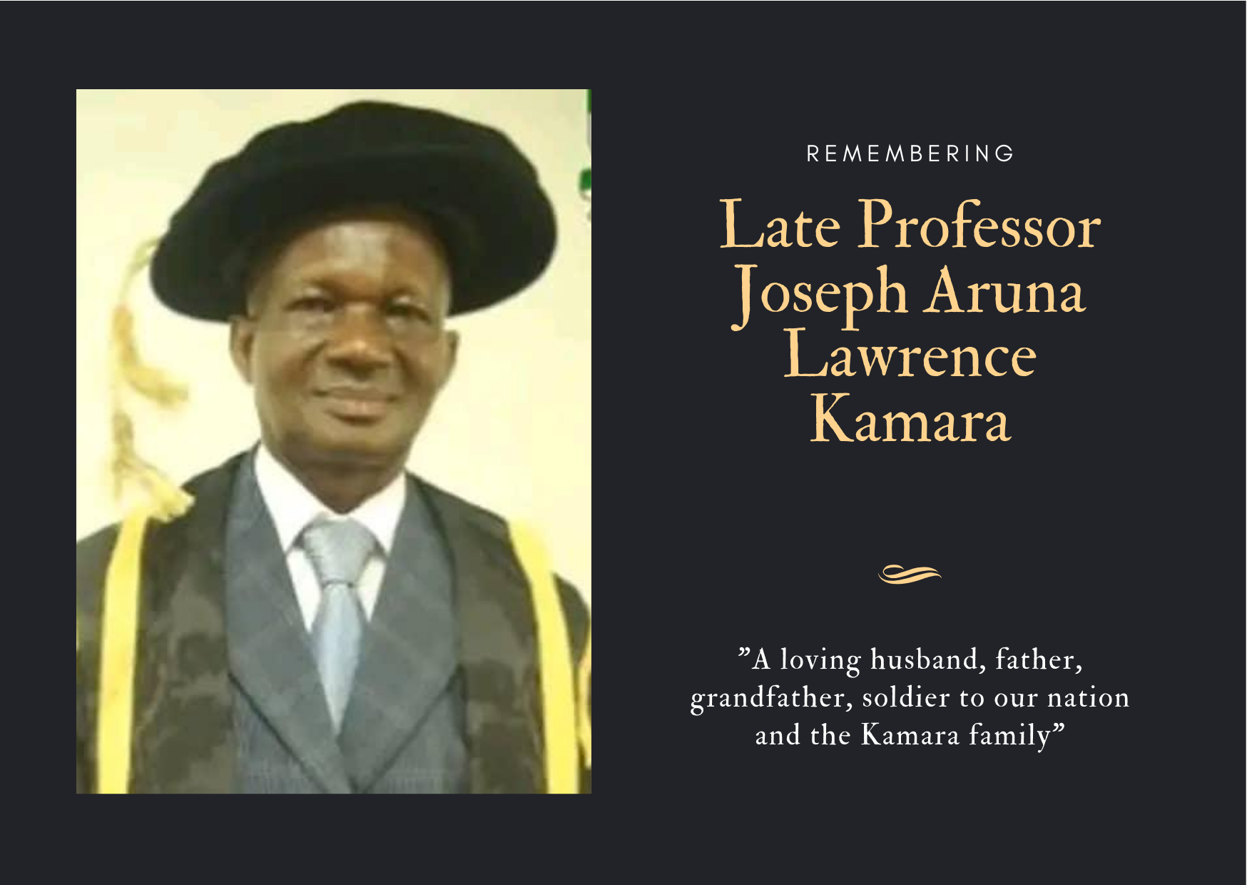 It is with deep sorrow, we mourn the passing of Professor Joseph Aruna Lawrence Kamara, who left us on the 10th of December, 2025. His loss is not only a great blow to his family, but to the entire academic community of Sierra Leone and all who had the privilege to learn under his guidance.
