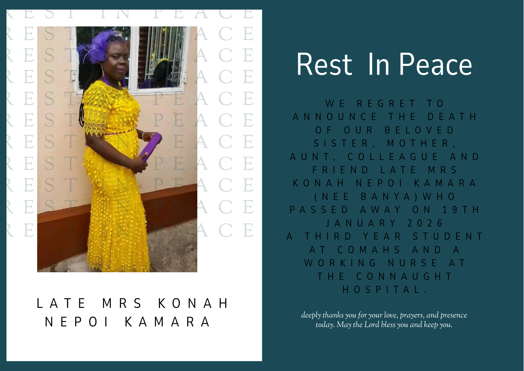 We regret to announce the death of our beloved Sister, Mother, Aunt, colleague and friend late Mrs Konah Nepoi Kamara (Nee Banya)who passed away on 19th January 2026