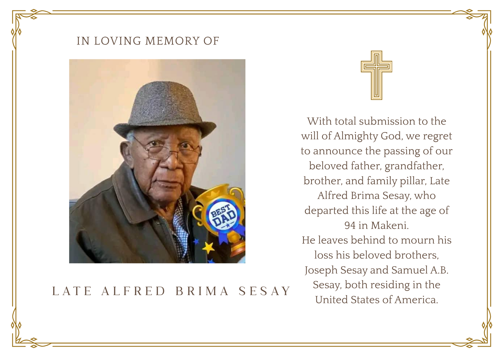 With total submission to the will of Almighty God, we regret to announce the passing of our beloved father, grandfather, brother, and family pillar, Late Alfred Brima Sesay, who departed this life at the age of 94 in Makeni.