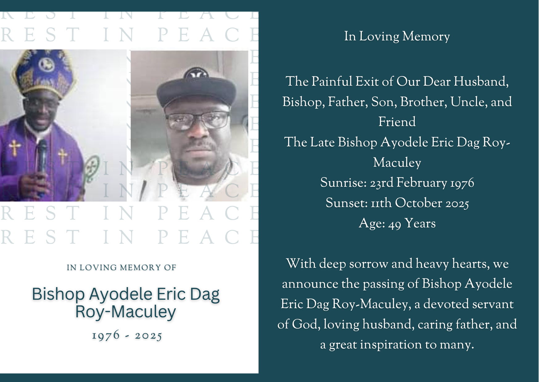 With deep sorrow and heavy hearts, we announce the passing of Bishop Ayodele Eric Dag Roy-Maculey, a devoted servant of God, loving husband, caring father, and a great inspiration to many.