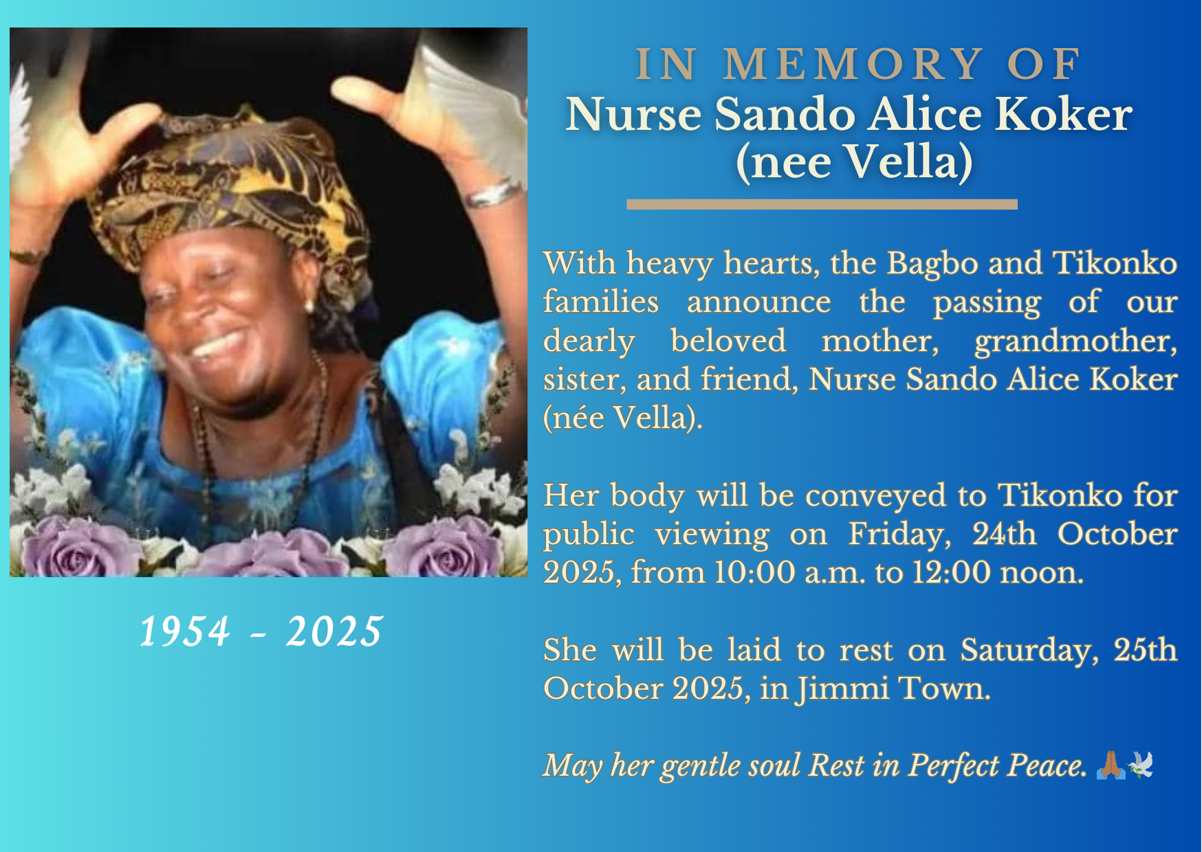 Her body will be conveyed to Tikonko for public viewing on Friday, 24th October 2025, from 10:00 a.m. to 12:00 noon.