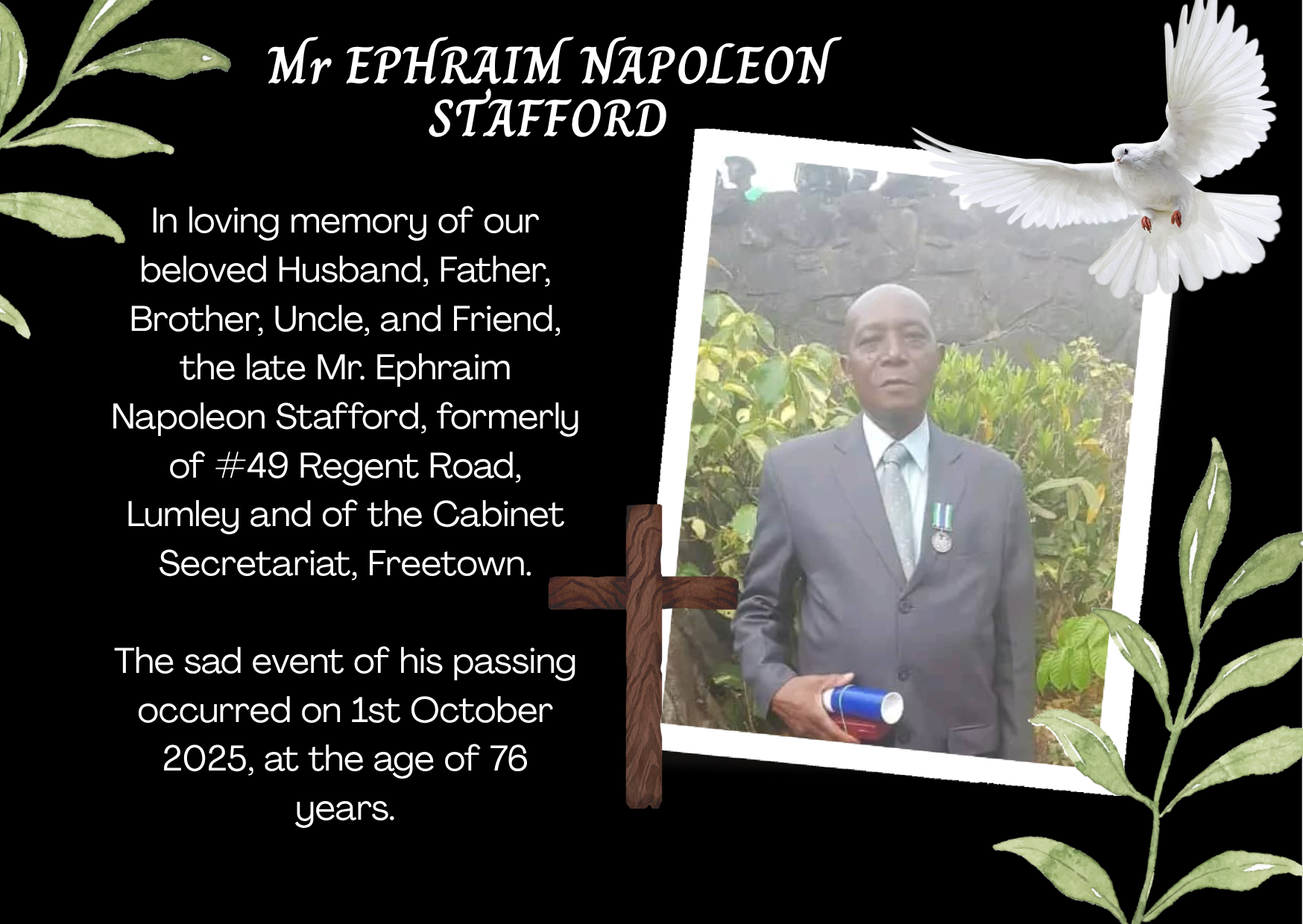 In loving memory of our beloved Husband, Father, Brother, Uncle, and Friend, the late Mr. Ephraim Napoleon Stafford, formerly of #49 Regent Road, Lumley and of the Cabinet Secretariat, Freetown.