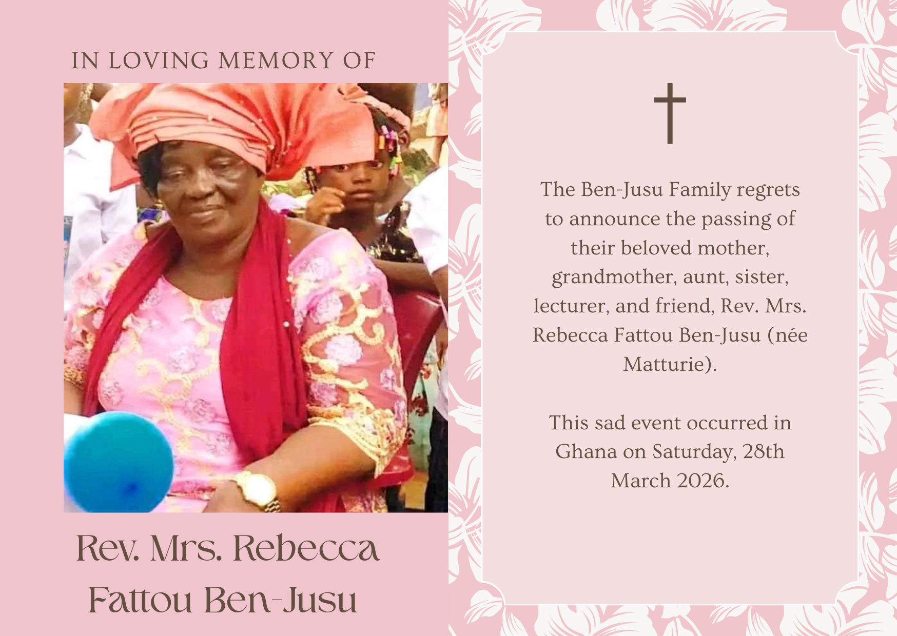 The Ben-Jusu Family regrets to announce the passing of their beloved mother, grandmother, aunt, sister, lecturer, and friend, Rev. Mrs. Rebecca Fattou Ben-Jusu (née Matturie).