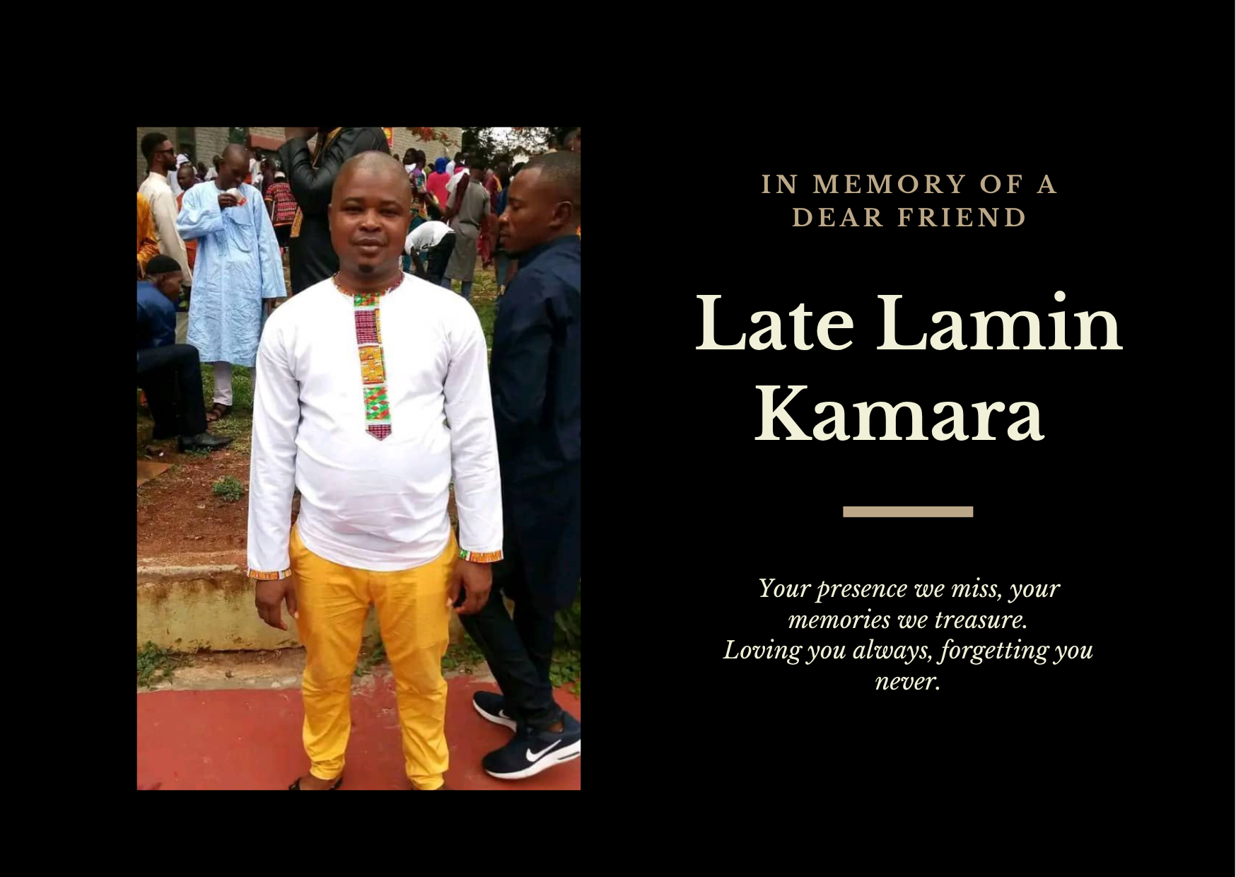 ObituariesINNA ILI WA INNA LILAH RAJIHUN John Wah4 months ago4 months ago01 mins Late Mr Lamin Kamara The sudden death is reported of our beloved brother, uncle and friend the late Lamin KamaraDied on 18th November 2025Age: 35He has already been buriedRest well brother Lamin. Share Post navigation Previous: May His Soul Rest In Perfect PeaceNext: It Is Well With Her Soul