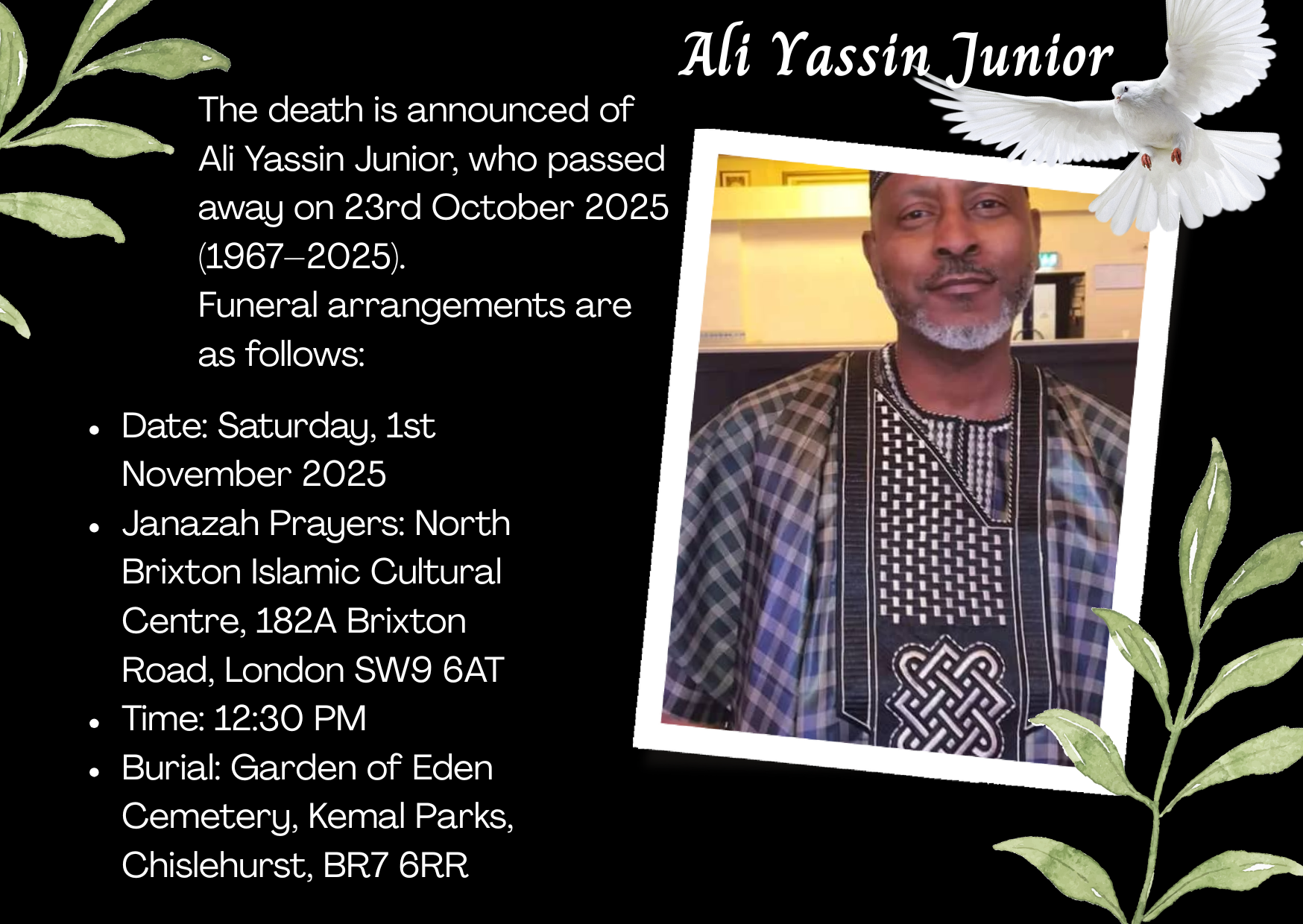 The death is announced of Ali Yassin Junior, who passed away on 23rd October 2025 (1967–2025).
