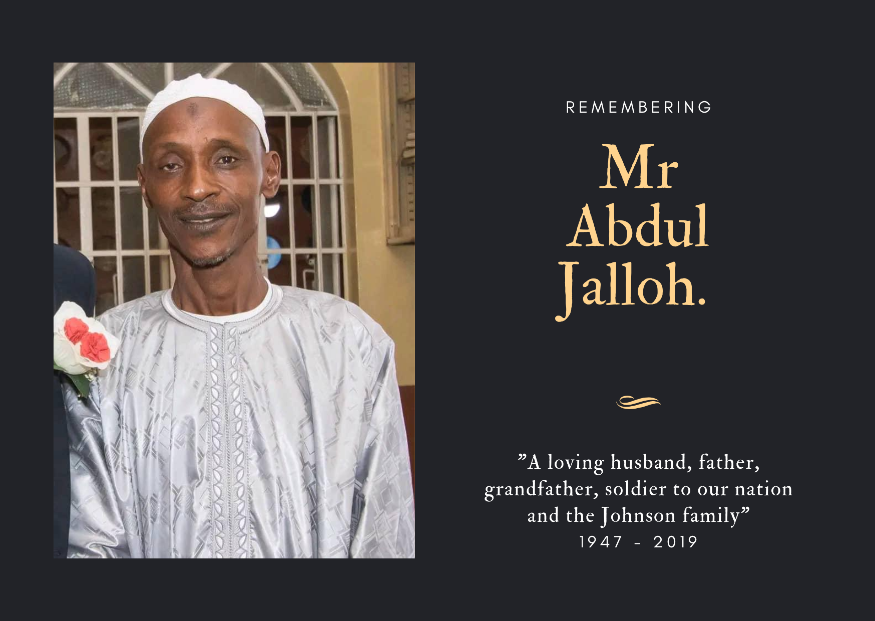 It is with great sadness in our hearts we regret to announce the death of our beloved brother Mr Abdul Jalloh.