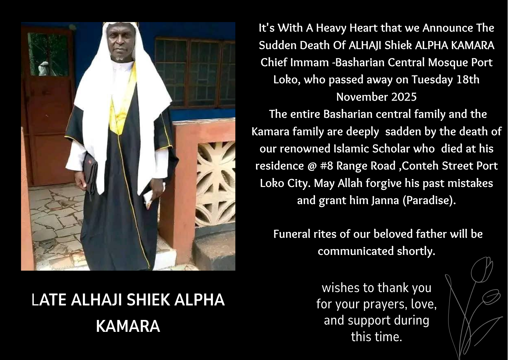 t’s With A Heavy Heart that we Announce The Sudden Death Of ALHAJI Shiek ALPHA KAMARA Chief Immam -Basharian Central Mosque Port Loko, who passed away on Tuesday 18th November 2025