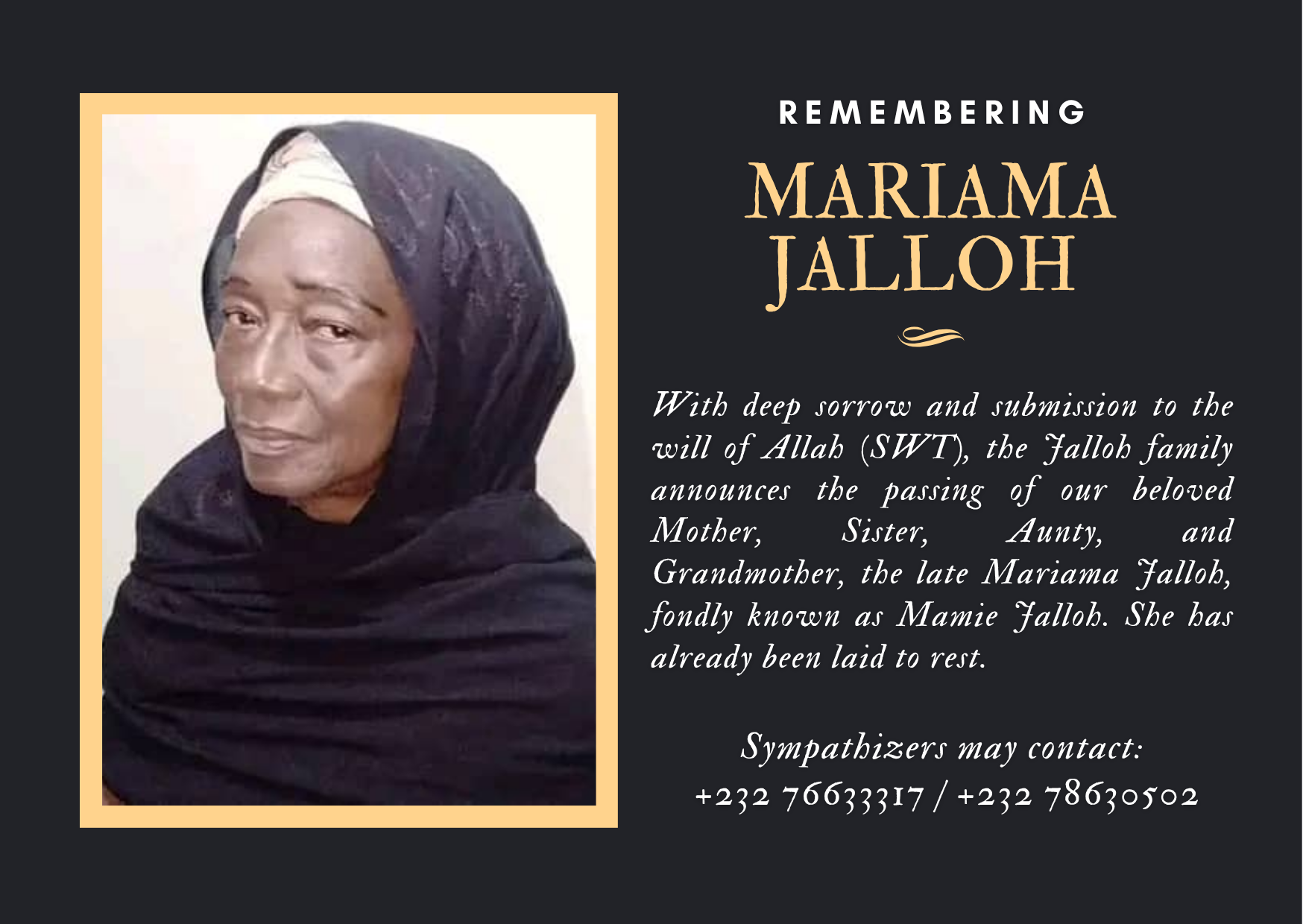 With deep sorrow and submission to the will of Allah (SWT), the Jalloh family announces the passing of our beloved Mother, Sister, Aunty, and Grandmother, the late Mariama Jalloh, fondly known as Mamie Jalloh. She has already been laid to rest.