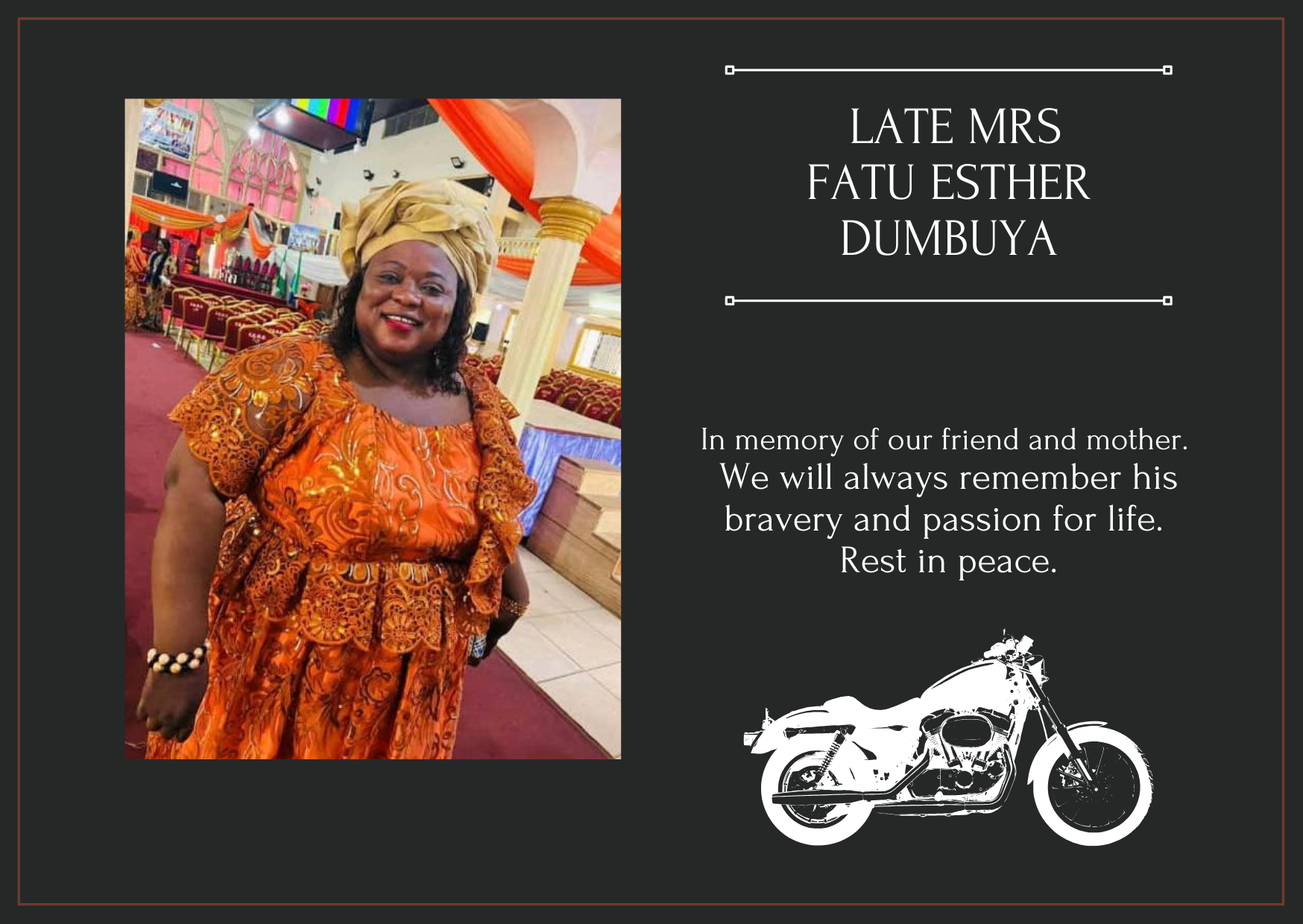 In Loving and Affectionate memory of our beloved mother, sister, Aunty and friend the late Mrs Fatu Esther Dumbuya( fondly called Fatu Bakay.)
