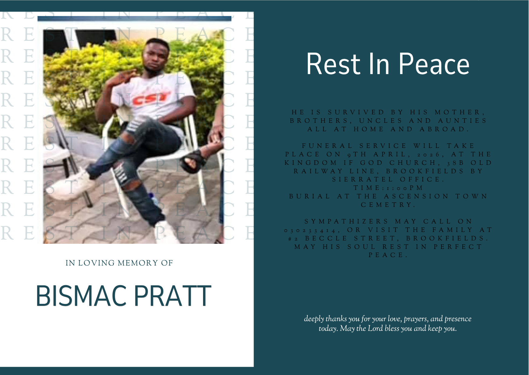 The family at home and abroad regrets to announce the passing of their beloved son,brother, and friend BISMAC PRATT.