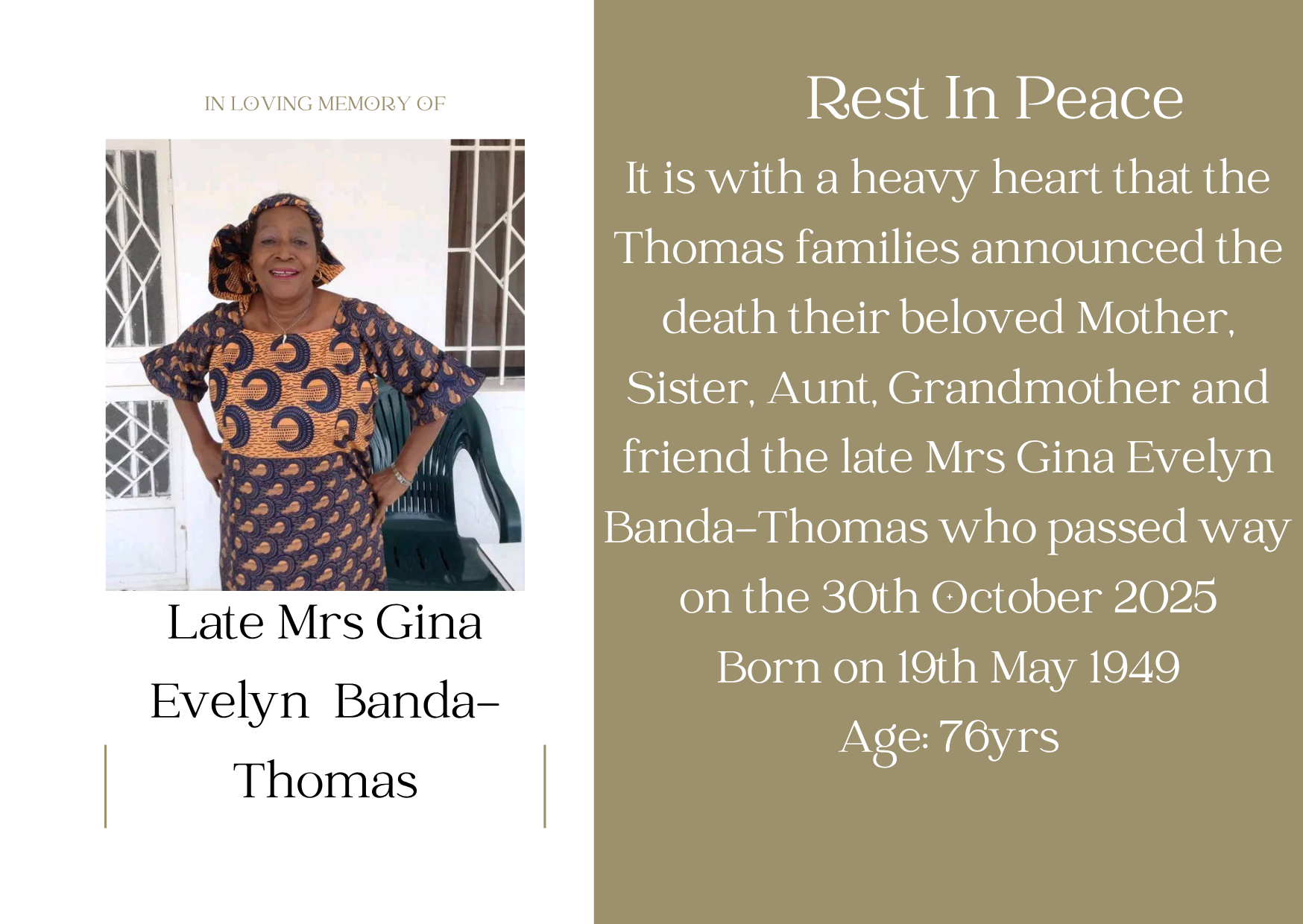 It is with a heavy heart that the Thomas families announced the death their beloved Mother, Sister, Aunt, Grandmother and friend the late Mrs Gina Evelyn Banda-Thomas who passed way on the 30th October 2025