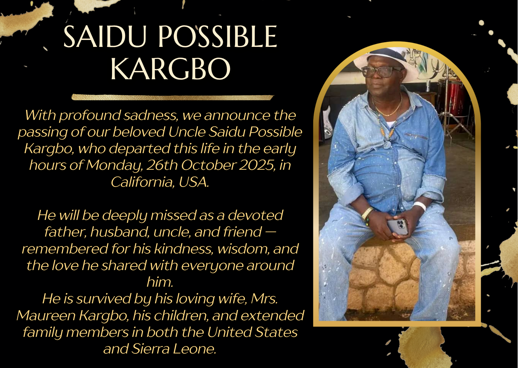 With profound sadness, we announce the passing of our beloved Uncle Saidu Possible Kargbo, who departed this life in the early hours of Monday, 26th October 2025, in California, USA.
