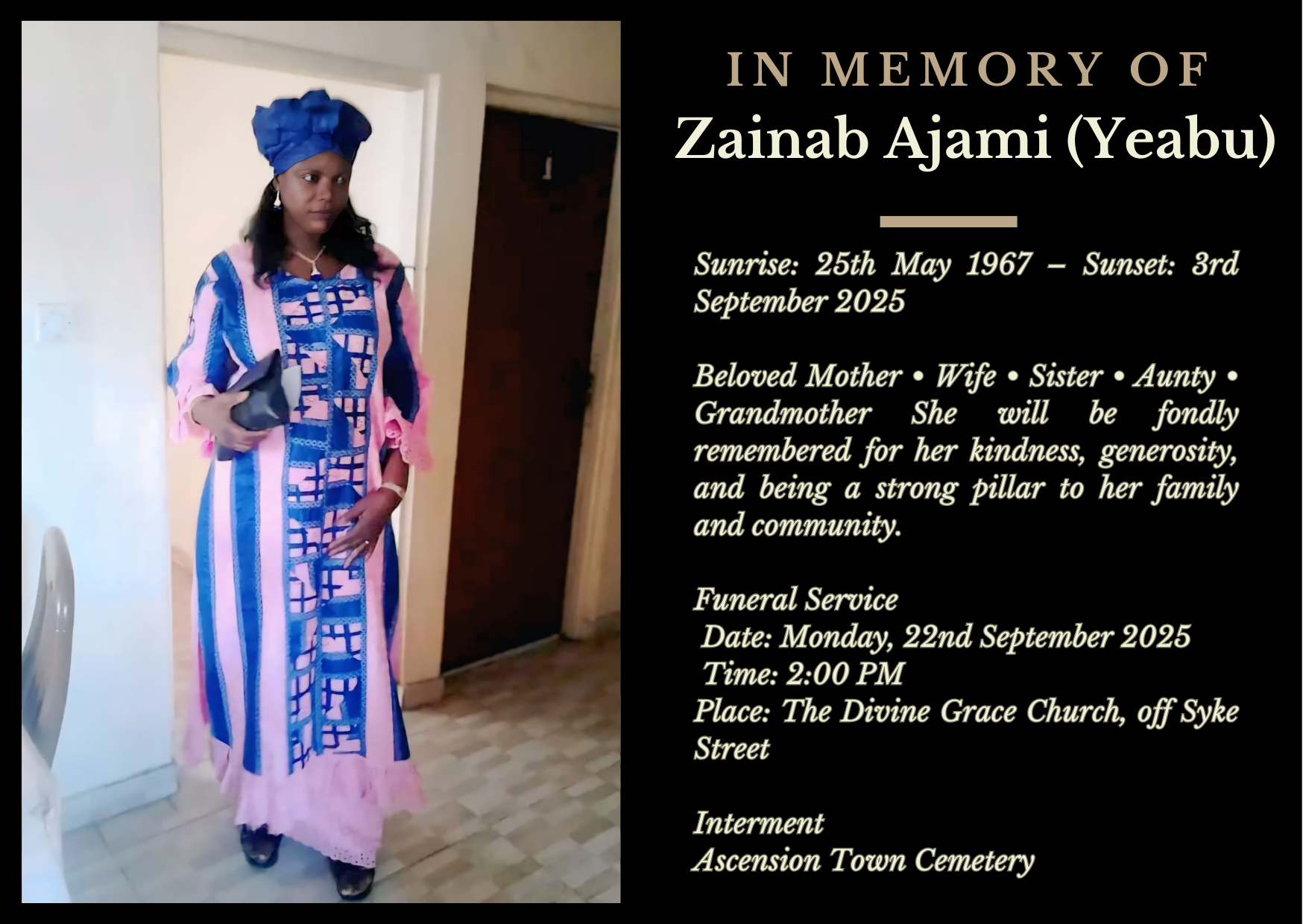 The Ajami family deeply regrets to announce the passing of their beloved Mother, Wife, Sister, Aunty, and Grandmother, the late Zainab Ajami (Yeabu), who passed away on Wednesday, 3rd September 2025, at the age of 58.