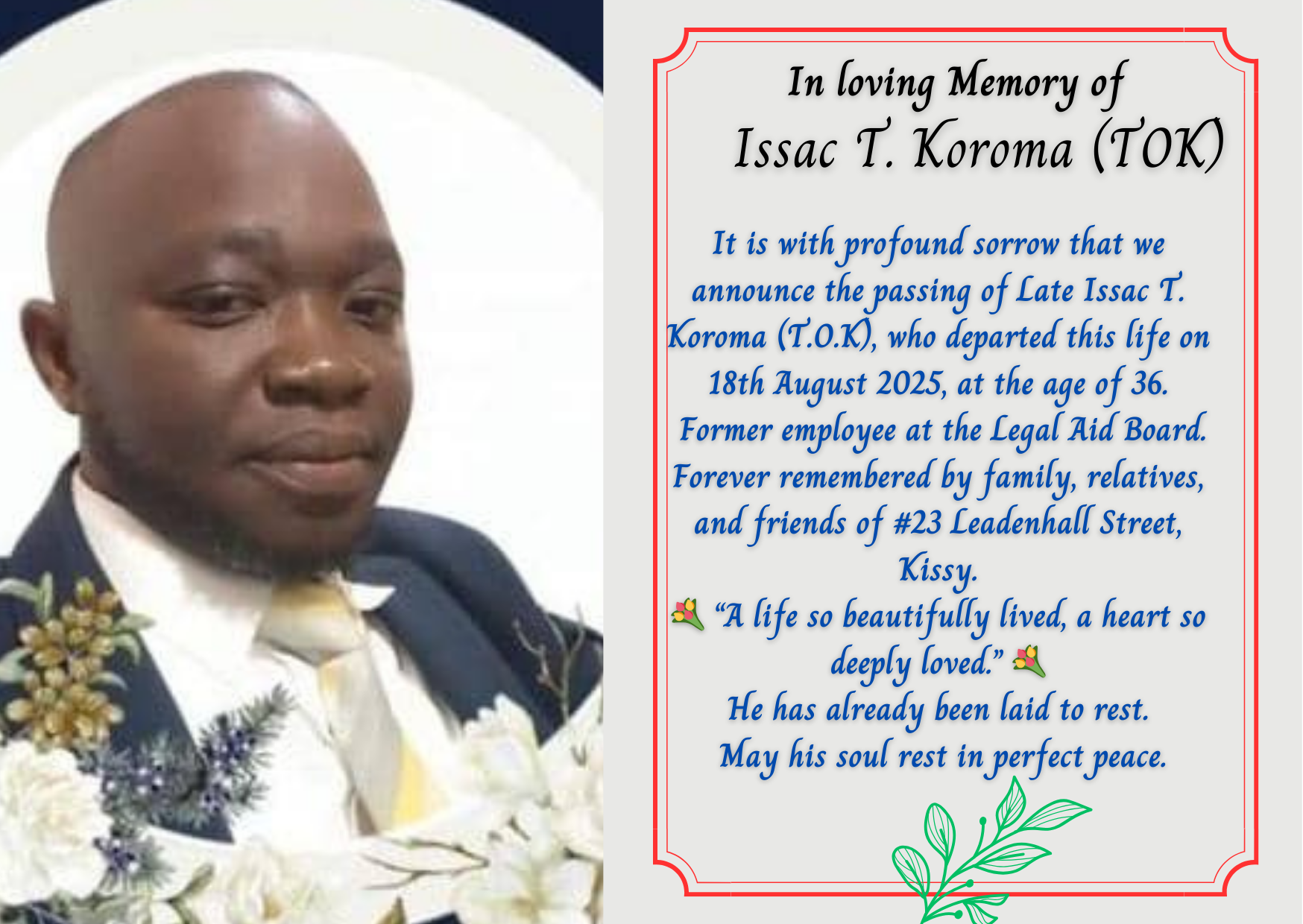 It is with profound sorrow that we announce the passing of Late Issac T. Koroma (T.O.K), who departed this life on 18th August 2025, at the age of 36.