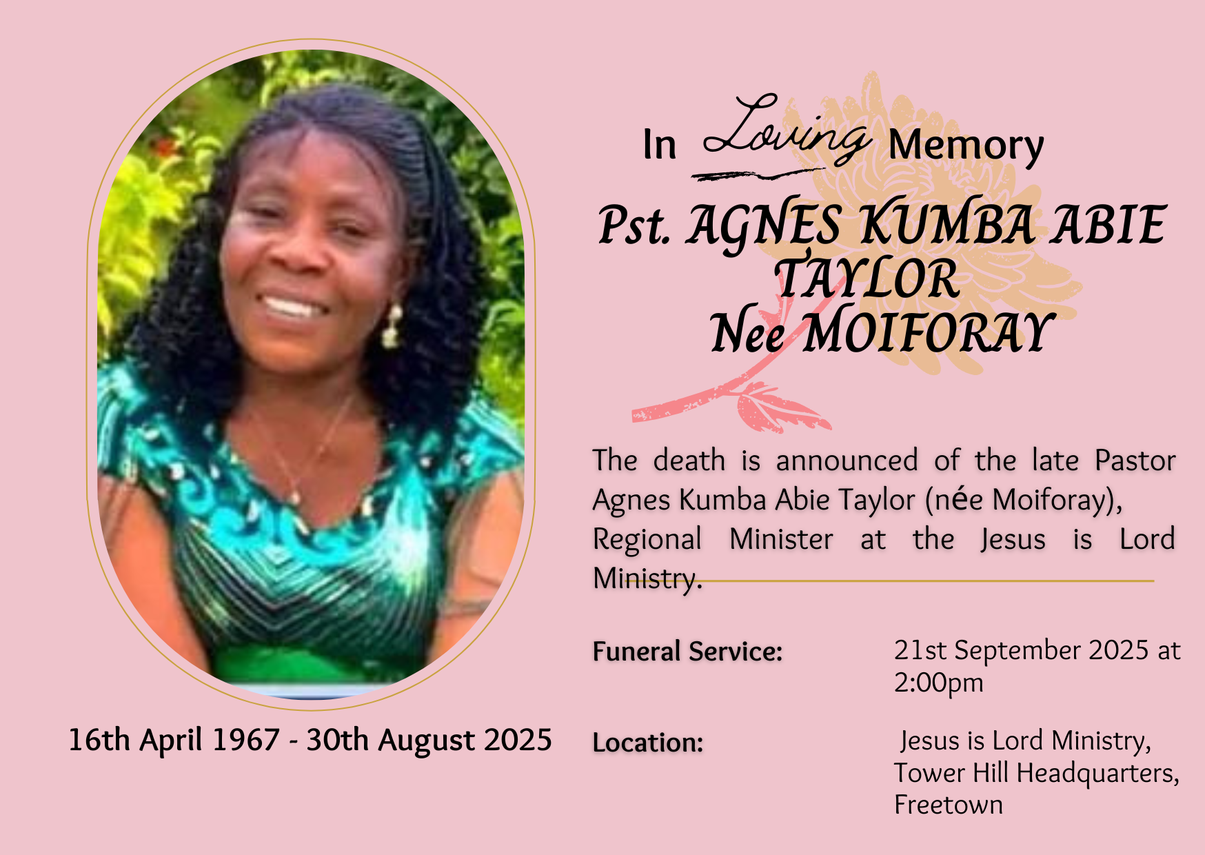 The death is announced of the late Pastor Agnes Kumba Abie Taylor (née Moiforay),
