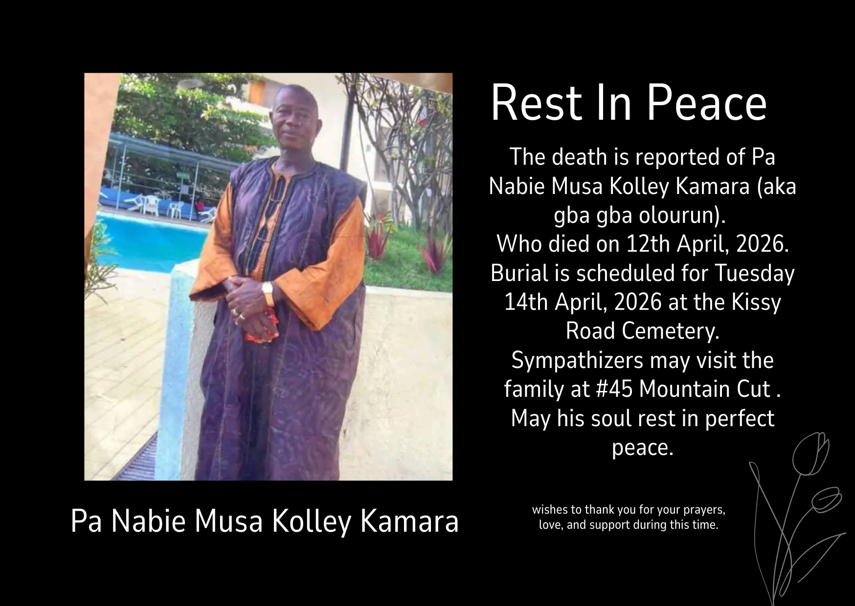 The death is reported of Pa Nabie Musa Kolley Kamara (aka gba gba olourun).