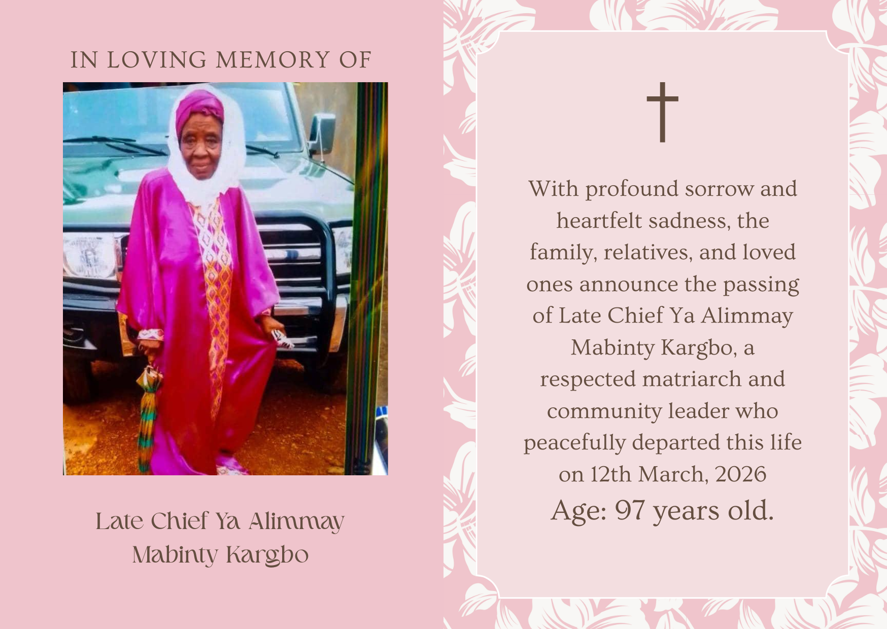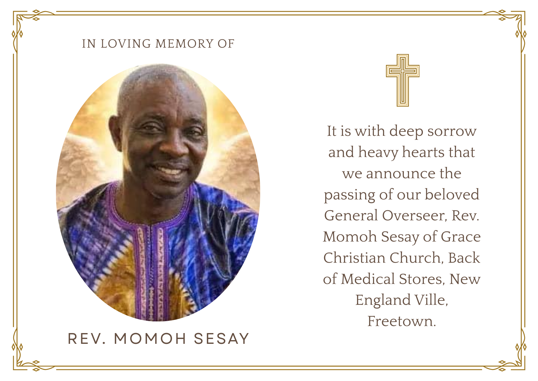It is with deep sorrow and heavy hearts that we announce the passing of our beloved General Overseer, Rev. Momoh Sesay of Grace Christian Church, Back of Medical Stores, New England Ville, Freetown.