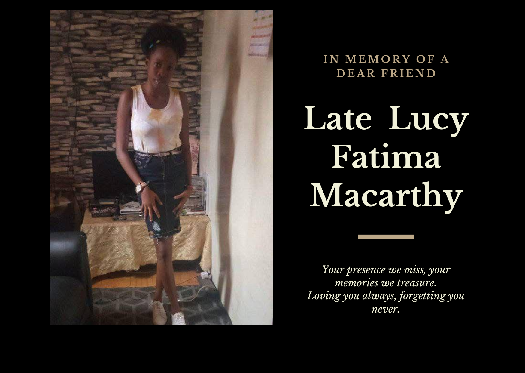 Survived by parents Mr Macarthy and mama Isatu, several siblings, cousins and other relatives.