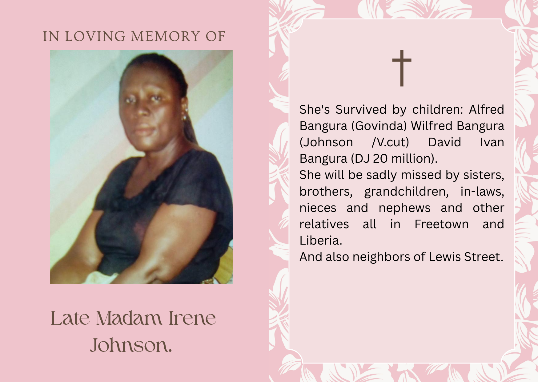 It’s with a heavy heart that we announce the passing out of our dearly beloved mother, sister, aunty, grandmother and friend the late Madam Irene Johnson.