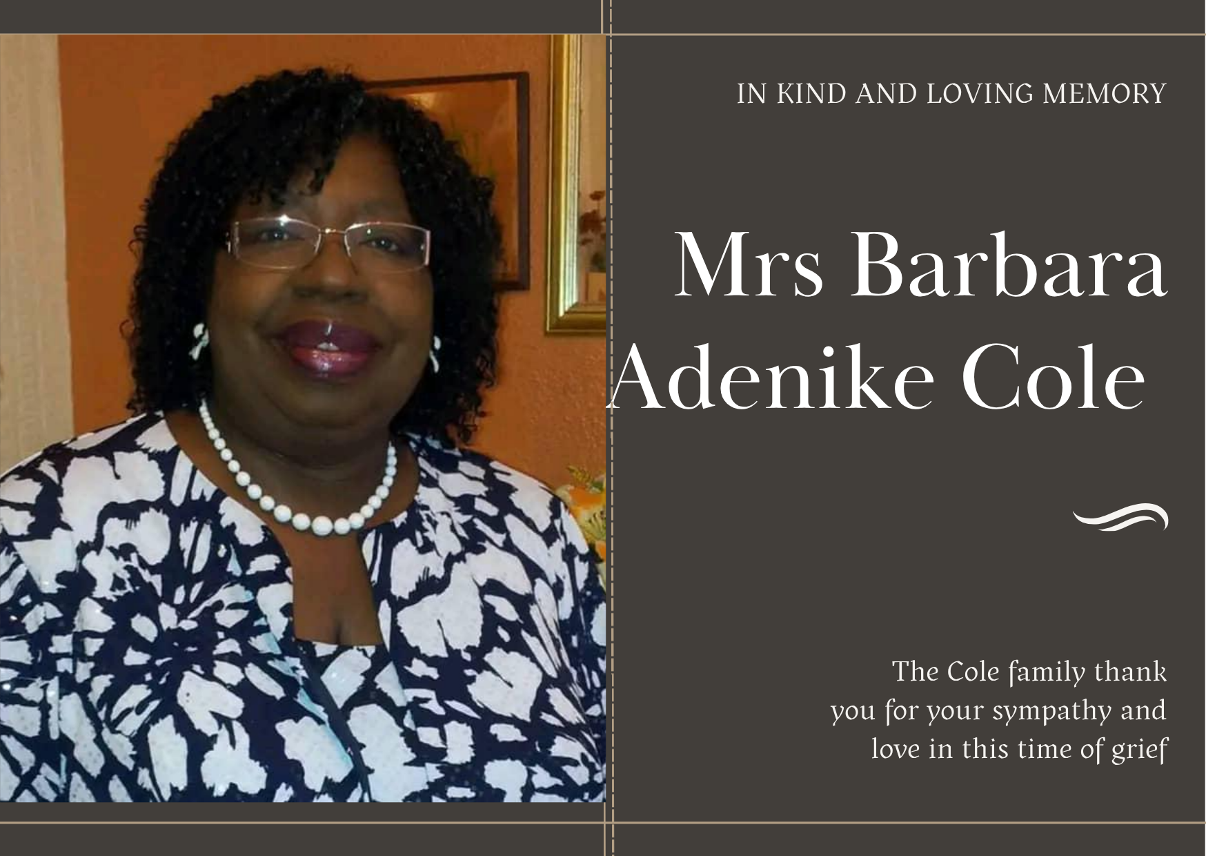 It is with great sadness we announce the passing of our beloved mother, sister, aunt and friend Mrs Barbara Adenike Cole (nee Nicol).