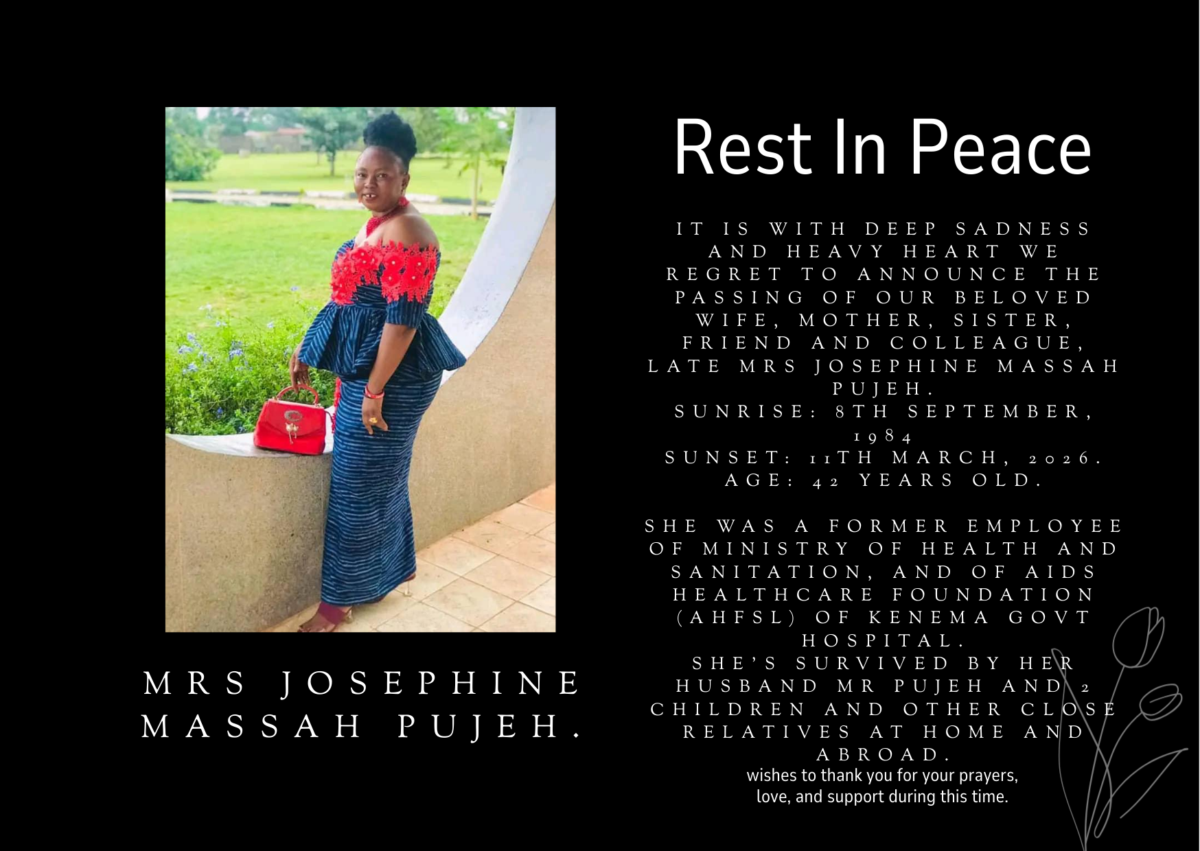 ObituariesRest In Perfect Peace John Wah2 hours ago2 hours ago01 mins Late Sister Monica Sandy, Funeral announcement…. The death is reported of Sister Monica Sandy, which sad event took place on Sunday 15th March 2026. Funeral arrangements will be announced later.May her precious soul rest in peace Share Post navigation Previous: A Faithful Servant of God (R.I.P)Next: It Is Well (R.I.P) Leave a Reply Cancel replyYour email address will not be published. Required fields are marked *Comment * Name * Email * Website Save my name, email, and website in this browser for the next time I comment.
