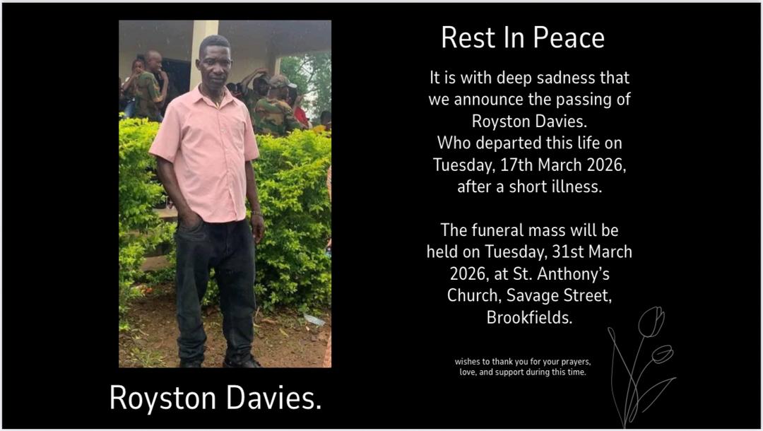 The funeral mass will be held on Tuesday, 31st March 2026, at St. Anthony’s Church, Savage Street, Brookfields.