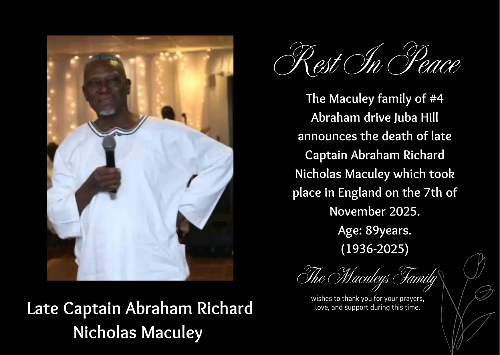 The Maculey family of #4 Abraham drive Juba Hill announces the death of late Captain Abraham Richard Nicholas Maculey which took place in England on the 7th of November 2025.
