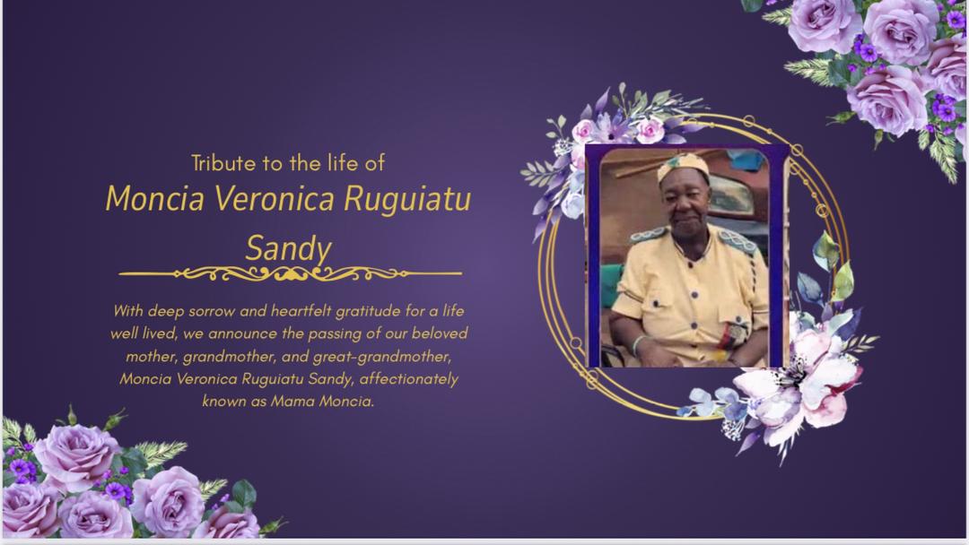 With deep sorrow and heartfelt gratitude for a life well lived, we announce the passing of our beloved mother, grandmother, and great-grandmother, Moncia Veronica Ruguiatu Sandy, affectionately known as Mama Moncia.