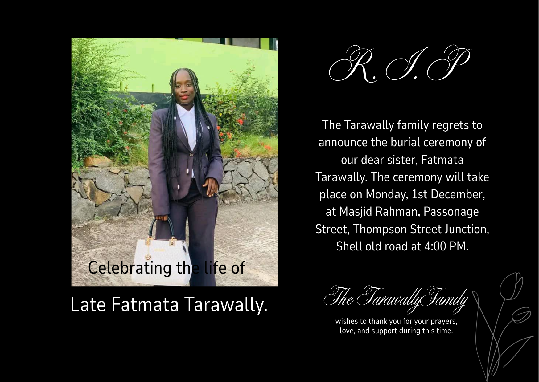 The Tarawally family regrets to announce the burial ceremony of our dear sister, Fatmata Tarawally. The ceremony will take place on Monday, 1st December, at Masjid Rahman, Passonage Street, Thompson Street Junction, Shell old road at 4:00 PM.