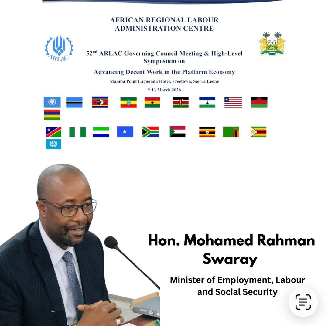 The Government of Sierra Leone will hold the 52nd Governing Council Meeting of the African Regional Labour Administration Centre (ARLAC), alongside a High-Level Symposium on “Advancing Decent Work in the Platform Economy.” The event is scheduled for March 9 to March 13, 2026, at the Mamba Point Hotel, Lagoonda in Freetown.