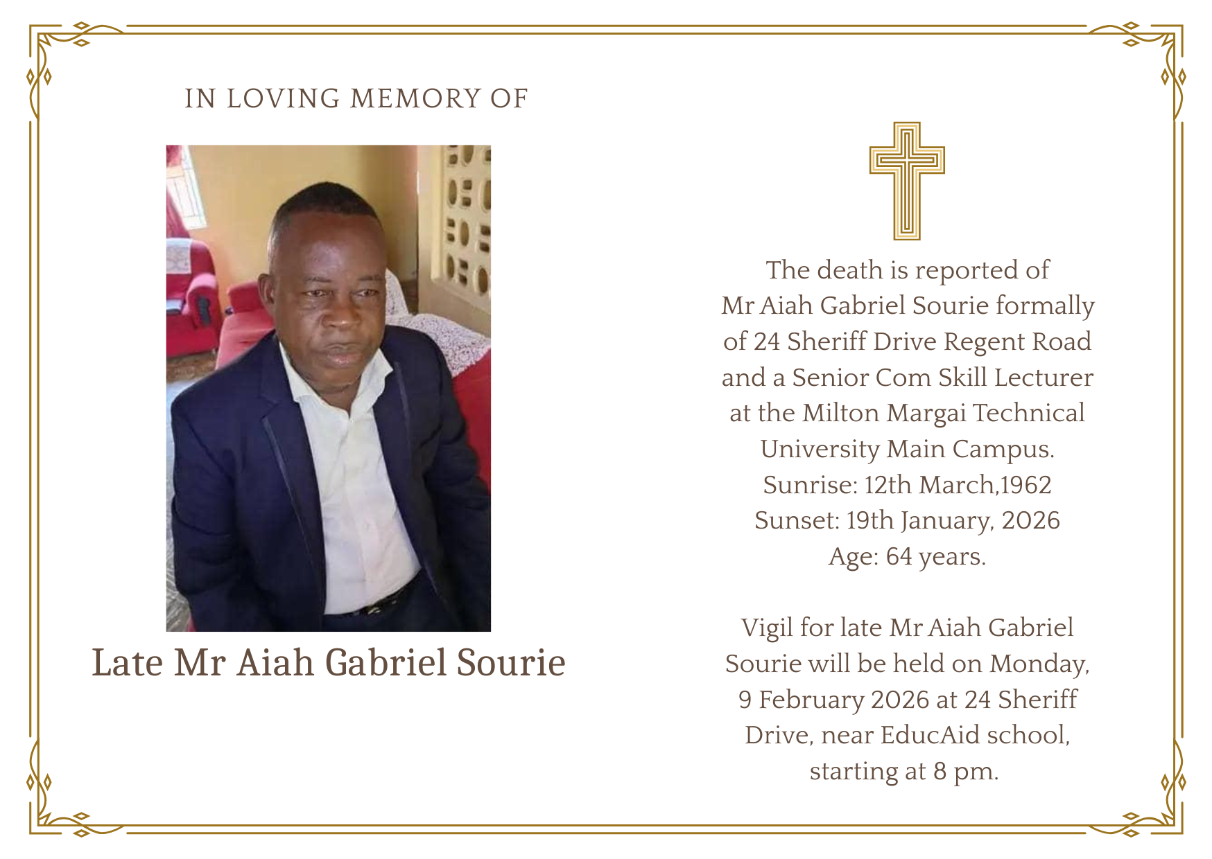 Vigil for late Mr Aiah Gabriel Sourie will be held on Monday, 9 February 2026 at 24 Sheriff Drive, near EducAid school, starting at 8 pm.