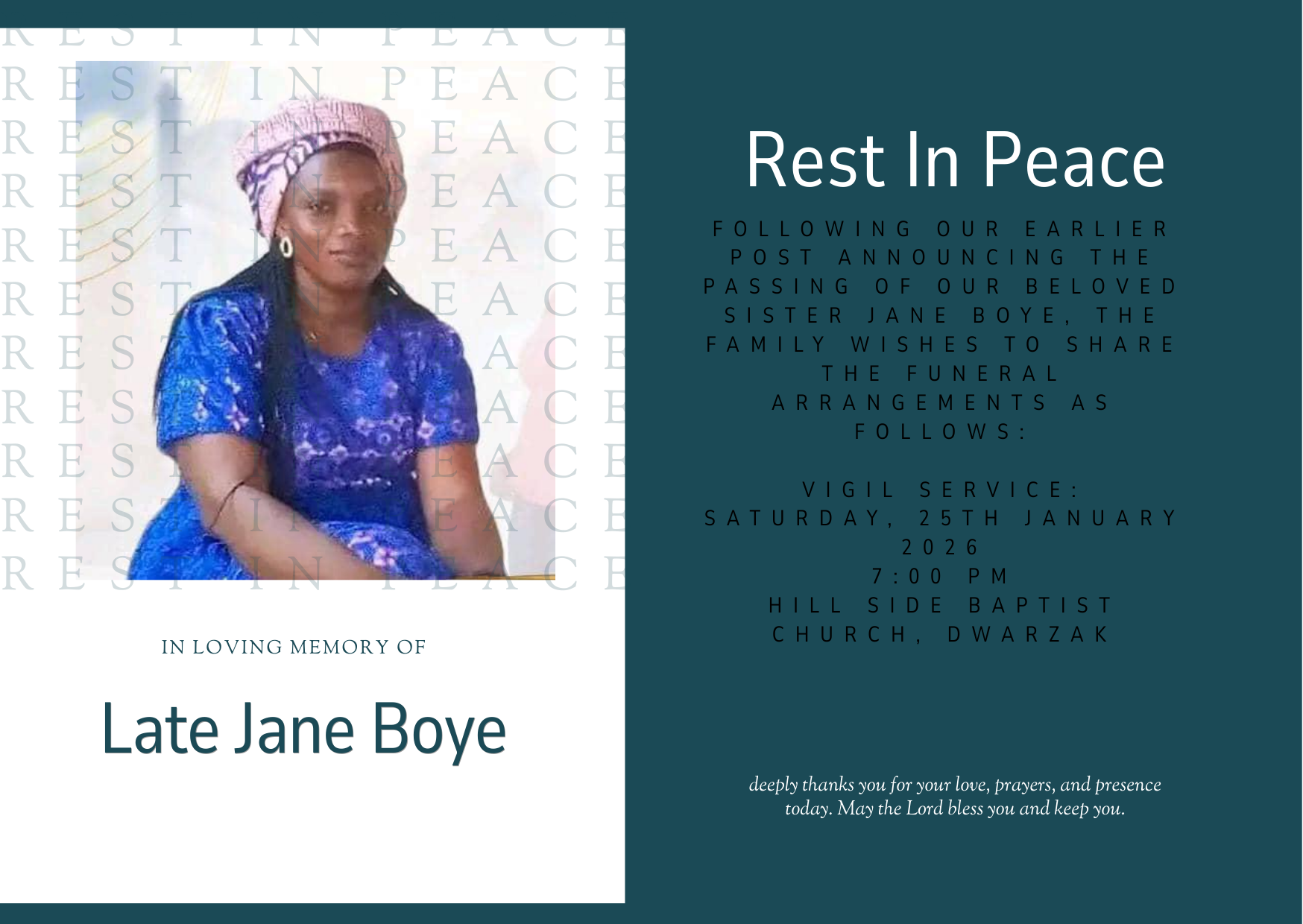 Following our earlier post announcing the passing of our beloved sister Jane Boye, the family wishes to share the funeral arrangements as follows: