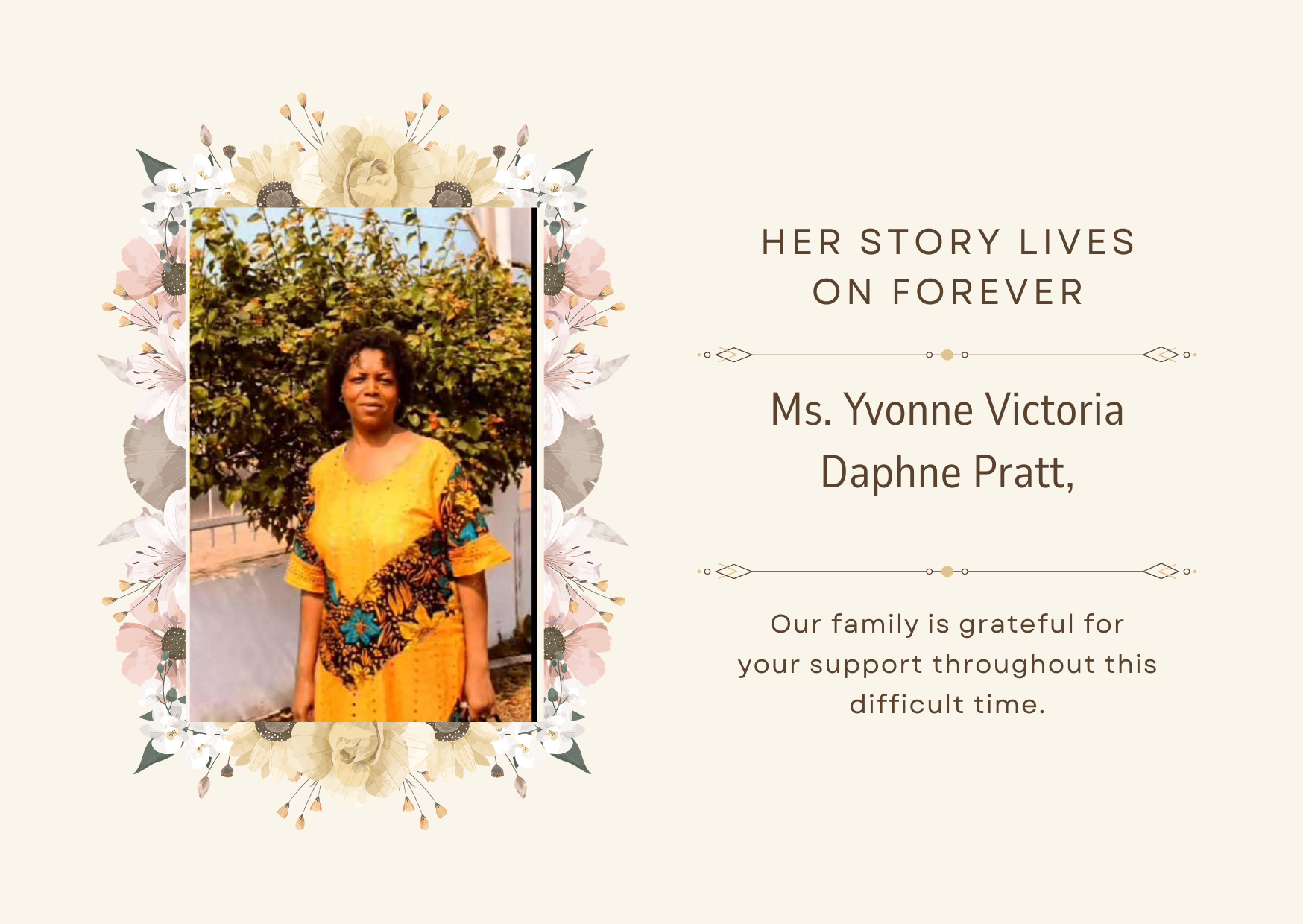 She’s survived by her children Marionette, Editha, Charlotte and Florence Smith, and other relatives at home and abroad.
